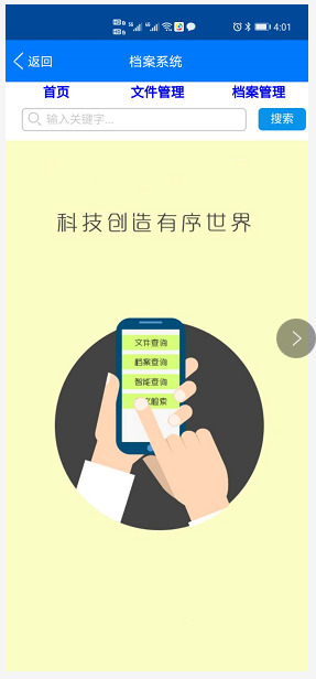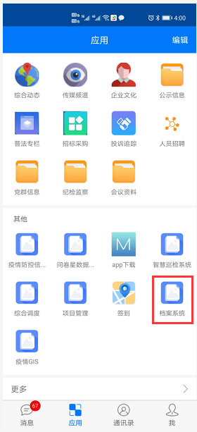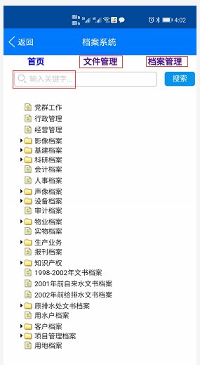 1、一般在OA的手机平台上做一个档案系统的图标链接,点击可进入到档案系统界面